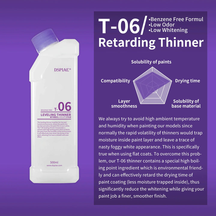 DSPIAE always try to avoid high ambient temperature and humidity when painting out models since normally the rapid volatility of thinners would trap moisture inside paint layer and leave a trace of nasty foggy white appearance. This is specifically true when using flat coats. To overcome this problem, our T-06 thinner contains a special high boiling point ingredient which is environmentally friendly and can effectively retard the drying time of paint coating (less moisture trapped inside), thus significantly reduce the whitening while giving your paint job a finer, smoother finish.
