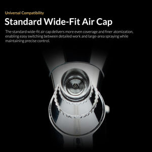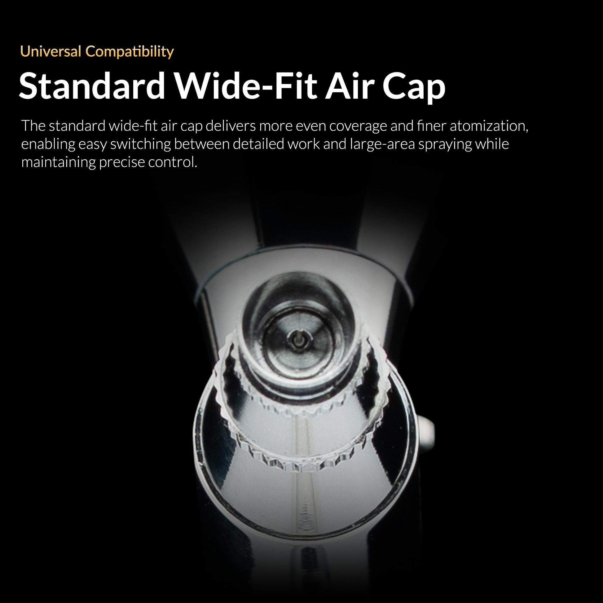 The standard wide-fit air cap delivers more even coverage and finer atomization, enabling easy switching between detailed work and large-area spraying while maintaining precise control.