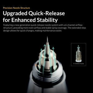 Featuring a new-generation quick-release nozzle system with a 6-channel airflow structure, providing more even airflow and stable spray coverage. The extended step design allows for quick changes, making maintenance easier.
