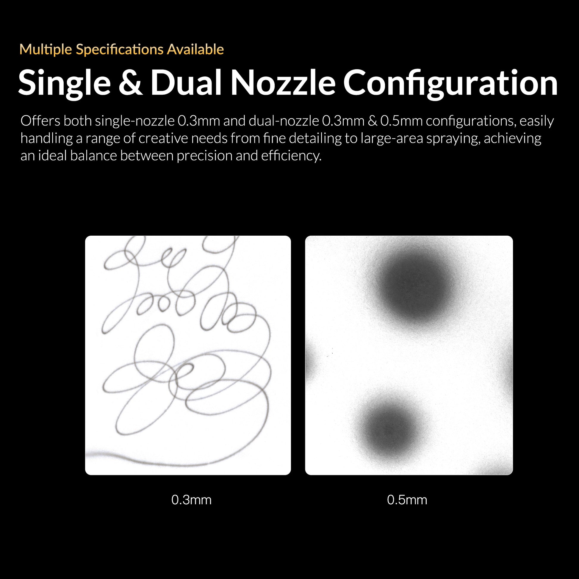 Offers both single-nozzle 0.3mm and dual-nozzle 0.3mm & 0.5mm configurations, easily handling a range of creative needs from fine detailing to large-area spraying, achieving an ideal balance between precision and efficiency.