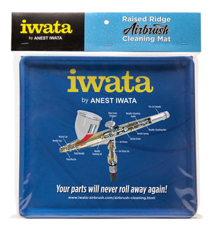 The Iwata Raised Ridge Airbrush Cleaning Mat is the perfect spot to disassemble and reassemble your airbrush. The raised ridge prevents your parts from rolling away. The soft fabric surface can handle most solvent-based cleaners and the non-skid backing keeps your mat in place. Use the airbrush cutaway diagram on the mat to see all the main parts of an Iwata airbrush. The Iwata Cleaning Mat is a must-have in any artist's studio and works just as well for cleaning other small parts that might roll off a workbench or table.